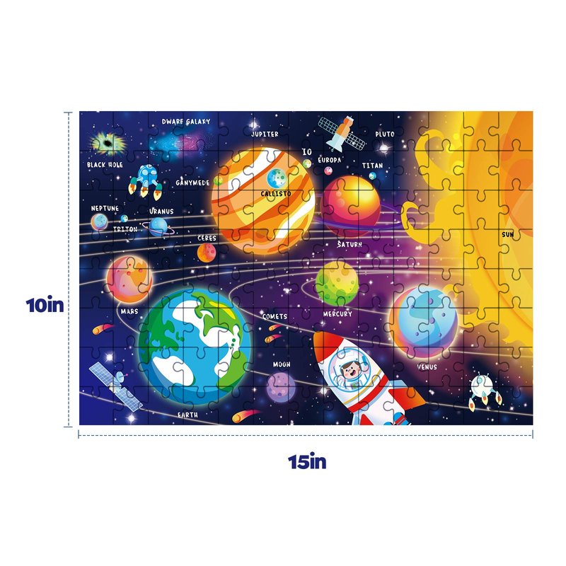 - Safe and Durable: Product made with FSC-certified. The space puzzles are made of 3mm thick recycled cardboard, safe and no special smell. Each piece of children puzzles are carefully cut, with smooth edges. Finished puzzle measures 15" x 10".