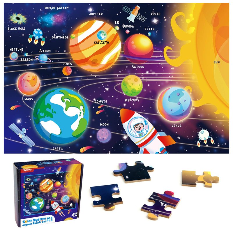 - Solar System Puzzle for Kids: This space puzzle set includes 104 pieces extra thick and durable cardboard pieces, depicted beautiful outer space. Fun patterns and bright colors easily attract toddler to focus on this puzzle.
