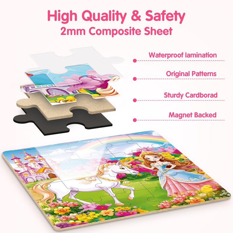 - MAGNETIC PUZZLES FOR GIRLS: Little girls love princesses, unicorns, fairy, and puzzles! The kid magnetic puzzles set includes three 20-piece advanced version puzzles with imaginative scenes, full of fun and challenge to provide a happier time for toddlers. Completed magnetic puzzles measure 6.9'' x 6.9'' each