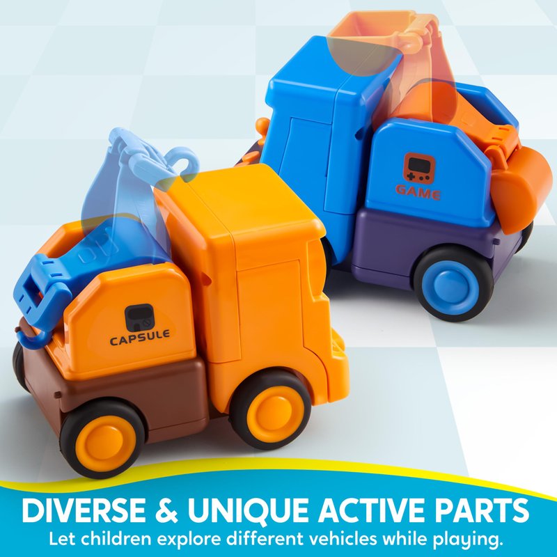 - Adorable Construction Vehicles: The set includes four cute construction vehicles—dump truck, trailer, cement mixer, and excavator—each with a unique expression to captivate young minds