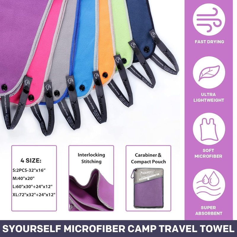 SYOURSELF 2 Pack Microfiber Camping Towel, Quick Dry Towel, Soft Absorbent Compact Travel Gym Workout Sweat Towel for Beach Yoga Swim Travel Camping Hiking Backpack Essentials (XL:72"x32"+12"x24")