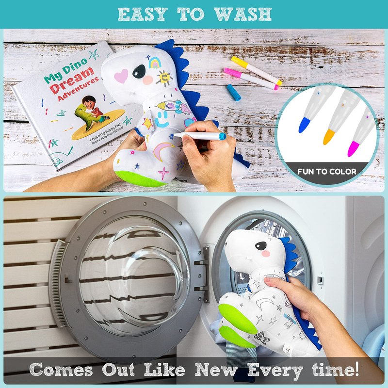 Get creative with the new dinosaur Doodle and wash plush doll! With the 3 included washable markers kids can create beautiful art projects. Simply color, wash and color again! The fun and creations are endless! This plush doll is machine washable. Also includes a childrens book!