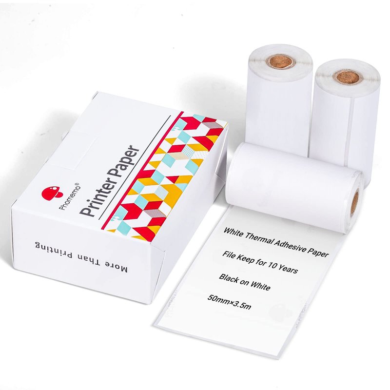 T02 Thermal Mini Sticker Printer Paper, White Self-Adhesive Paper, Black On White Paper for Journal, Photo, To Do List, 50mm x 3.5m, 3 Rolls, Keep for 10 Years (Only Compatible With T02 Printers)