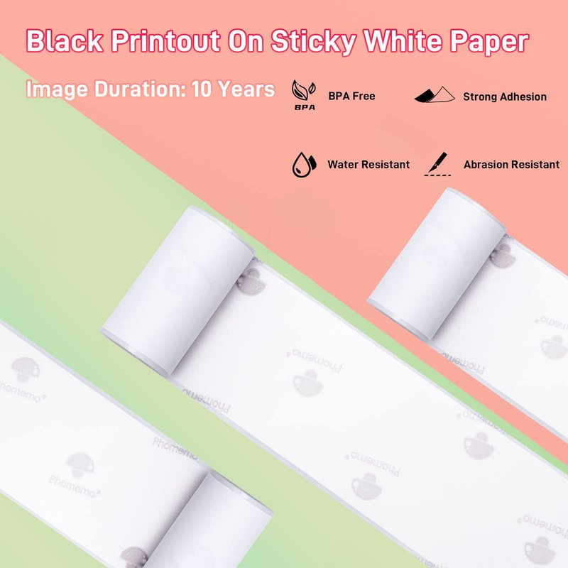 - [For All T02 Mini Printers]This self-adhesive paper, only compatible with any brands T02 sticker mini printers.The printing side faces down during use in T02 machine.Picture Duration: 10 Years.Size:50mm x 3.5m.Quantity:3 Rolls.