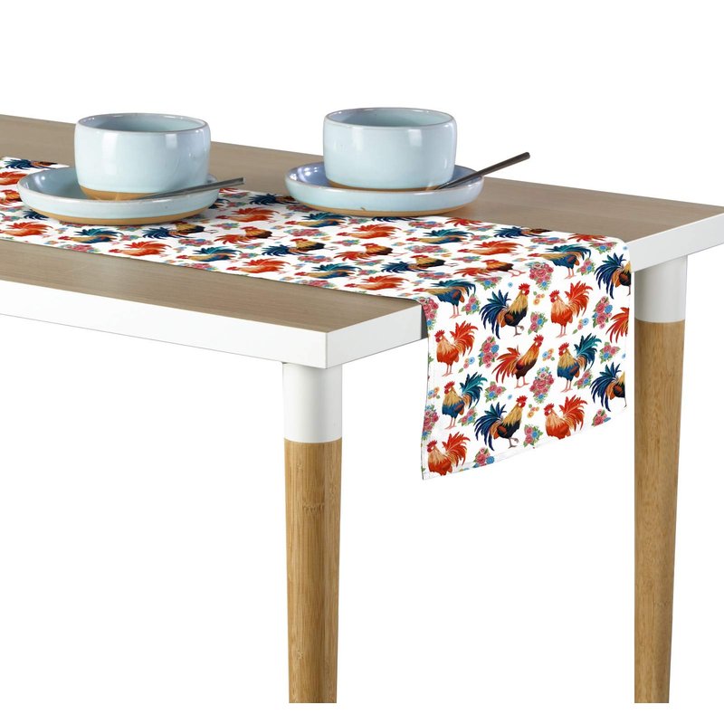 Table Runner, 100% Milliken Polyester, Machine Washable, 14x108, Rise & Shine Roosters