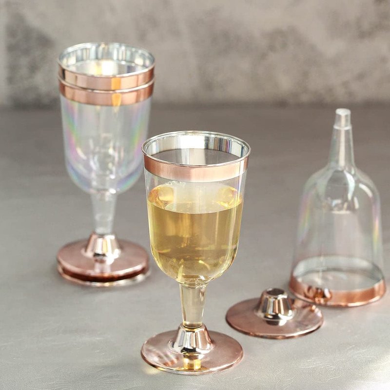 TABLECLOTHSFACTORY 12 Pack 6.5 oz Plastic Wine Glasses Disposable 2-Piece Rose Gold Rimmed Design With Detachable Base