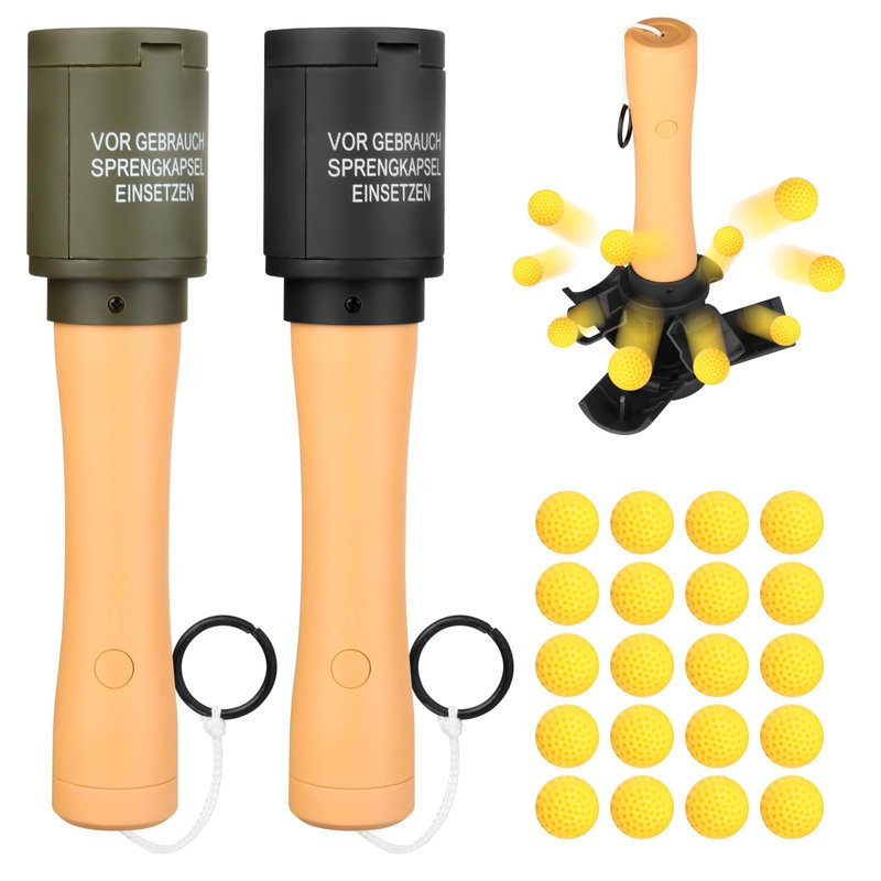 Tactical Toy-Grenade for CS Battle Game,2Pcs Fall Resistant Refillable Fun Impact Pull Ring Grenade Toy with 20 Foam Ammo for 14+ Outdoor Sport