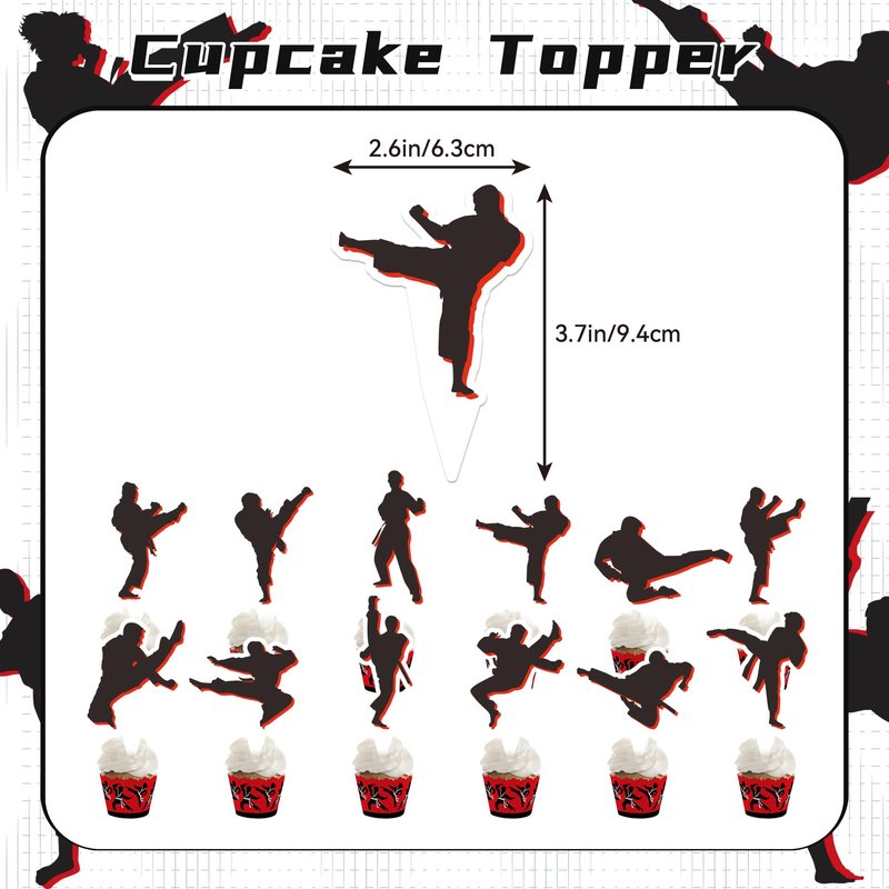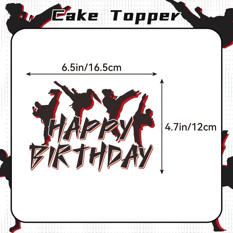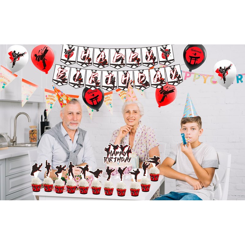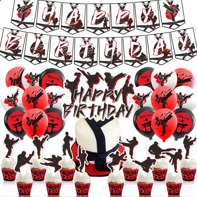 - Taekwondo Party Supplies: You will get 1 HAPPY BIRTHDAY banner, 1 HAPPY BIRTHDAY cake topper, 12 cupcake toppers, 18 taekwondo balloons (6 black, 6 red, 6 white), 1 ribbon.