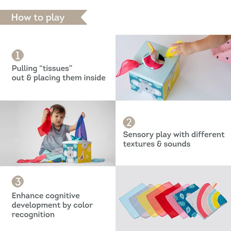 - LEARNING SKILLS – This sensory tissue box is inspired by toddlers’ fascination with wet wipes, tissue boxes & paper. Toddlers love to pull tissues out of containers & spread them all over the floor. Playing with our Tissue Box helps baby learn about emptying & filling containers. This sensory tissue box will entertain babies for hours with its vibrant colors, crinkly sounds, and pull-along scarfs Baby Crinkle toys are the perfect sensory toy for babies & helps develope motor & cognitive skills