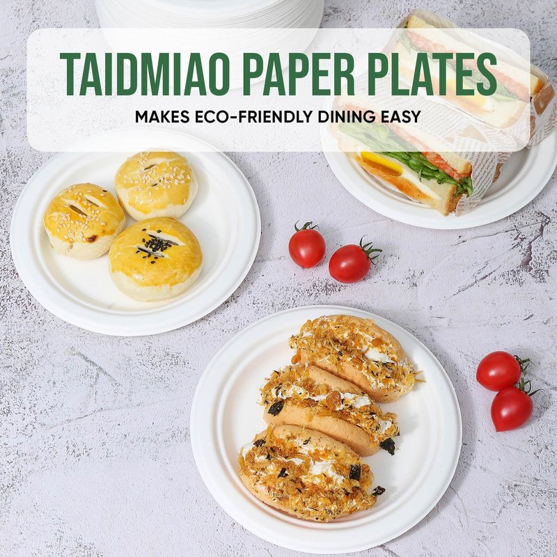 - GO GREEN WITH SUSTAINABLE MATERIALS - TaidMiao eco-friendly and heavy-duty paper plates are made from 100% biodegradable sugarcane pulp. Not only are they good for the environment, but they are also water and oil-proof, allowing you to enjoy soups and stews without worrying about soggy plates.