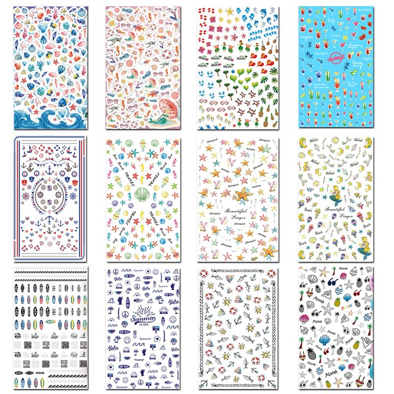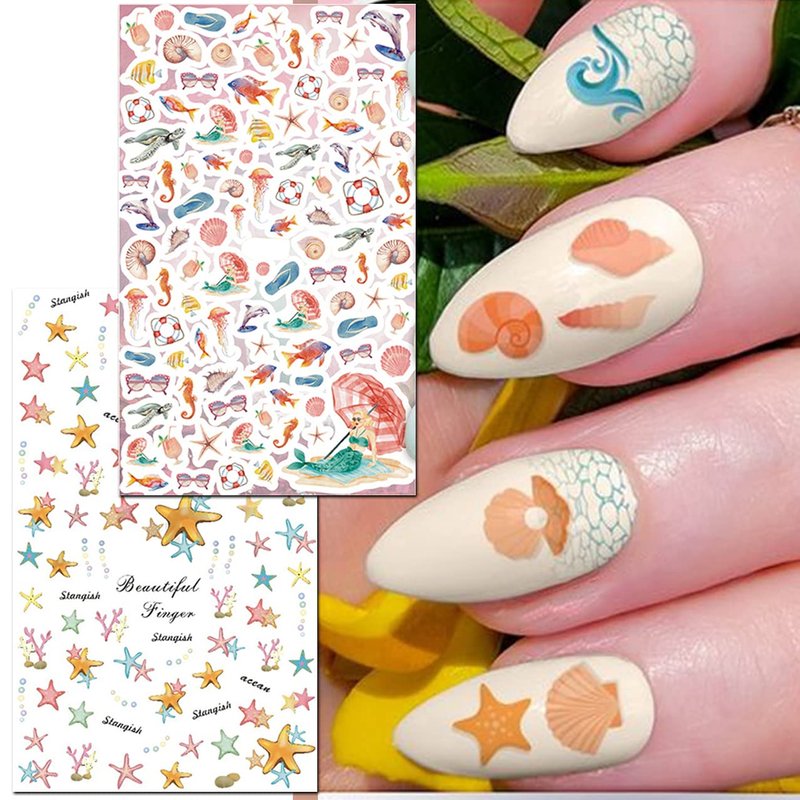 - MULTIPLE DESIGNS AVAILABLE: 1500+Pcs stickers are the perfect nail decals. Includes all sorts of classic images: Beach/Ocean/Nutical theme: Shark, Turtle, Dolphin, Tropical fish, Shells, Starfish; Sailboat, Anchor, Rudder, Lifebuoy, Cocktails, Sunglasses, Mermaids.
