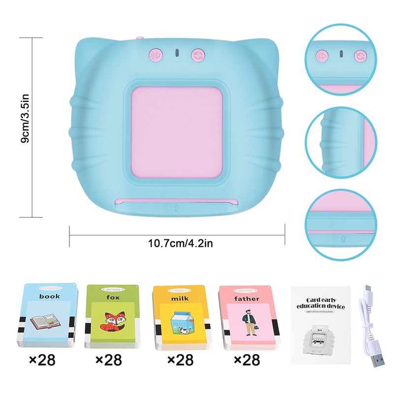 - 【What Do You Get】A set includes a card reader *1, a double-sided flash card*112 with a total of 224 words, a USB charging cable*1 and an instruction manual*1.