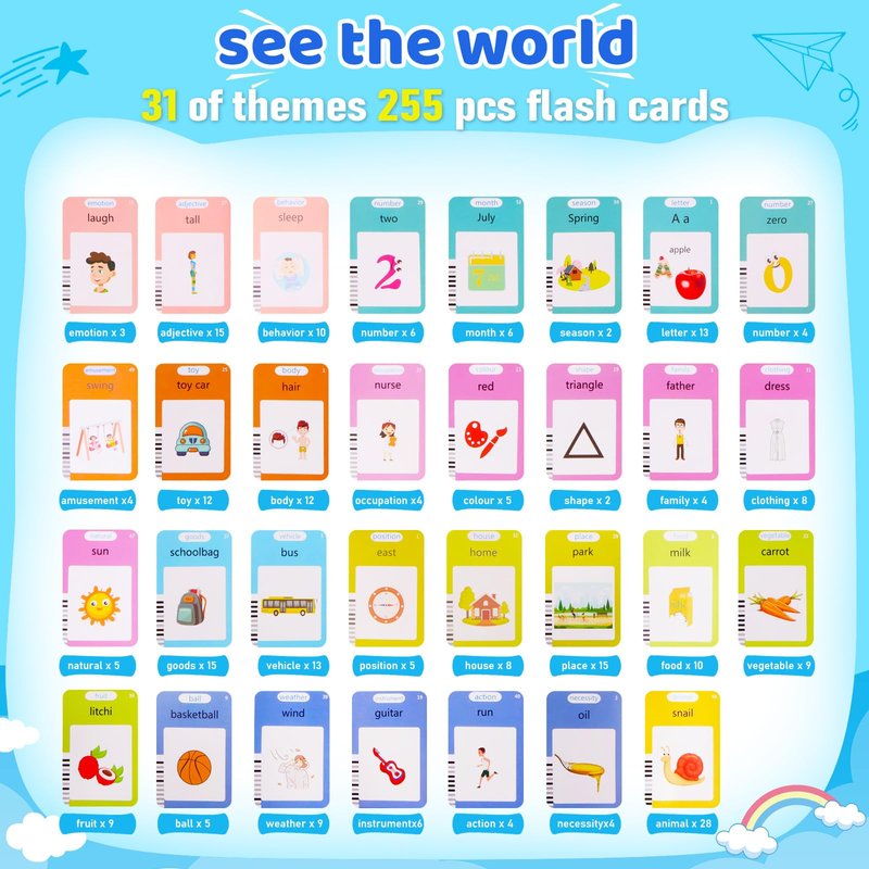- ✿【Montessori Sensory Toys】Talking Flash Cards, This upgraded set contains a card reader, 255 cards ,510sides, 31 topics in total, such as letters, numbers, animals,colors, shapes, family members, transportation, behavior, months,,etc, Cartoon Flashcards, clear pronunciation, interesting sound effect, repeating reading and sighting words greatly simulate kids’ imagination and broaden horizons while enjoying fun.