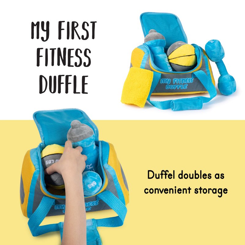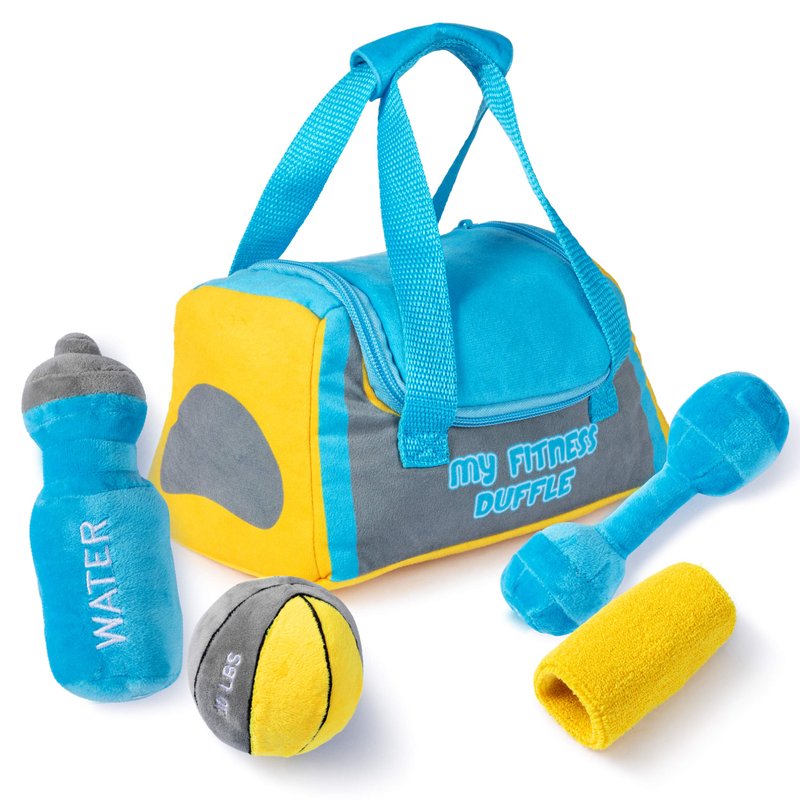 Talking Plush Baby Workout Toys | Baby Crossfit Toy | Plush Fitness Duffle Toy Set | 4 Talking Soft Plush Workout Gear | Medicine Ball, Dumbbells, Sweatband, & Water Bottle | Plush Duffle Bag Carrier