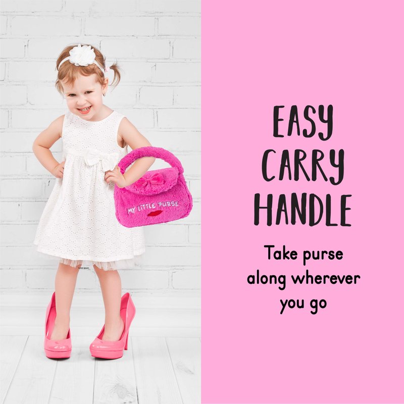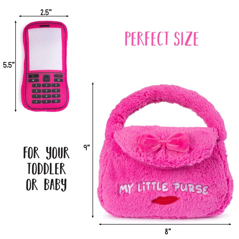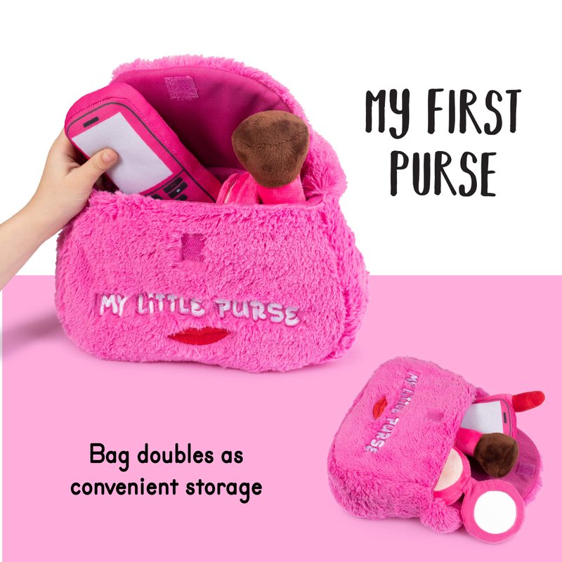 - π WHATβS INCLUDED: Plush Creations brings you a new super cute and fluffy playset, βMy First Purse.β Our 5 piece beautifully designed fluffy, hot pink plush handbag set comes with 4 unique pretend play plush toys that talk and say what they are. It includes a small mirror, a makeup brush, a red lipstick, and a cellphone. Perfect for an infant and/or toddler fashionistas to play and carry. Surprise your sweet little princess with her 1st real handbag today!