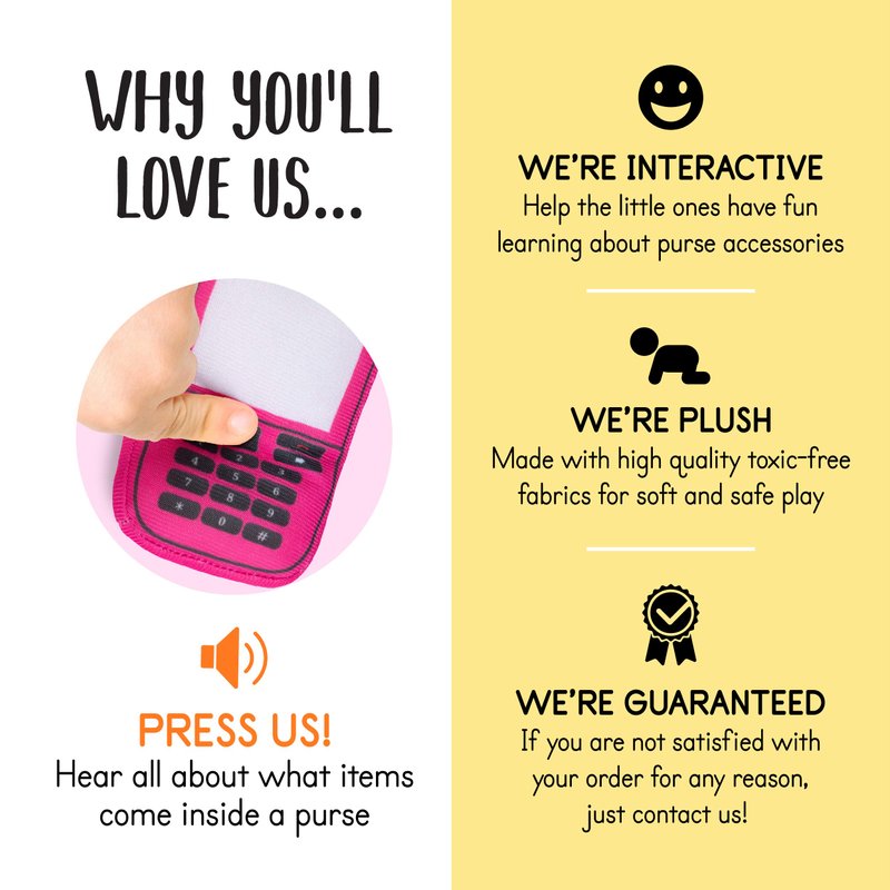 This super cute play set is the perfect plush accessory toy for your little one(s). The set - which is super easy to store and keep neat - includes a fluffy pink plush handbag, small mirror, makeup brush, lipstick, and a cellphone. The great thing about this is that it doubles as an interactive and educational toy! The items in the purse are push-to-talk to help promote fine motor skills and encourage role-play. Your child will have tons of fun playing pretend with this adorable purse. Here is what each accessory says when you push them: π± - "I have a cellphone" and plays a ringtone! π - "My lipstick. I put it on my lips." ποΈ - "My brush. I brush my makeup" π - "My mirror - see how cute I am." All of the items in this set, as well as everything else at Plush Creations, are made from non-toxic premium materials for the softest and best quality! This makes it 100% safe for all newborn infants, babies and toddlers. Cleaning and sanitizing is also a breeze, just use a damp cloth.