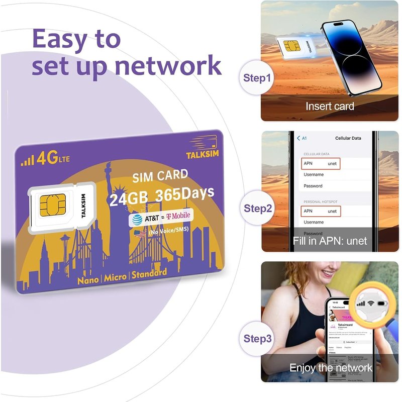 TALKSIM Data SIM Card 24GB for 365 Days Support AT&T, T-Mobile Networks, USA SIM Card 4G LTE for Unlocked Security Camera/Router/Mobile WiFi Hotspot/Tablet/Hunting Trail Camera IoT Devices 【Great 4G Nationwide Coverage】This TALKSIM SIM card offers 24GB of wireless service for 365 days with strong 4G coverage nationwide. It connects to the fast 4G LTE networks of major US carriers AT&T and T-Mobile, automatically choosing the carrier with the strongest signal. This Data only SIM card ensures reliable access to the national data network, providing seamless connectivity across the United States. 【Plug & Play】Using a 4G SIM card is a simple process with plug-and-play features. Just insert the SIM card into any unlocked 4G device, set up the APN settings, and you're good to go. If you run out of data, the data SIM card provides various affordable and adaptable data plans to choose from, and it can be easily recharged within the same month. 【Wide Compatibility】Our IoT SIM card is available in three different sizes to accommodate a wide range of devices. This Standard/Micro/Nano SIM card is ideal for various 4G unlocked IoT gadgets like security cameras, router modems, mobile hotspots, smartwatches, smartphones, tablets, game/trail hunting cameras, 4G PoC walkie talkies, Android radios, and car/pet GPS tracker devices. 【Safe And Reliable】You can rest assured about the affordable pricing of the 4G LTE SIM card, as it come with low monthly costs. There are no contracts, credit checks, activation fees, advance activation requests, insertion fees, personal ID requirements, hidden charges, or taxes. Additionally, it offers the convenience of automatic subscription cancellation. The Cellular SIM card remains active for 12 months without activation. It's data only SIM card, without voice, SMS or phone number. 【Superior Support】The TALKSIM prepaid SIM card USA provides continuous technical support. If you encounter any inquiries or problems with the US SIM card, please do not hesitate to get reach. Our goal is to provide outstanding service to you, which also covers the ICCID number.