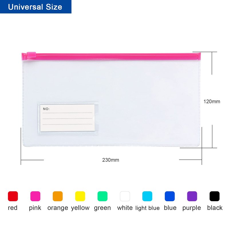 - Size: The zip envelope size is 9 x 4.7in/23x12cm. Can accommodate A6 size documents.