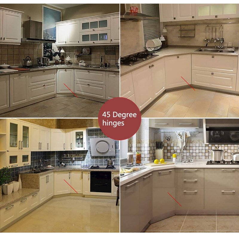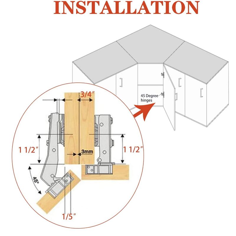 Opening Angle - 110 Degree. Suitable for installation of the side panels without 90 degree angle. Package included: 1 pair 45 degree concealed cabinet hinges (mounting screws are included)