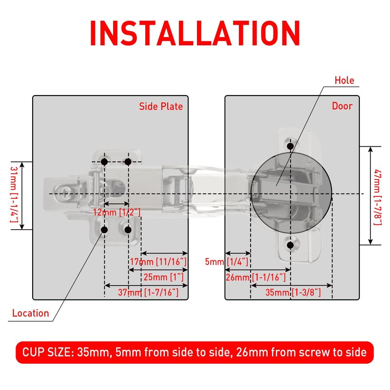 - SPECIFIC MEASUREMENTS - Hinges with a cup size of 35mm x 12mm and a top hole distance of 48mm, fitting door thickness range of 15-19mm