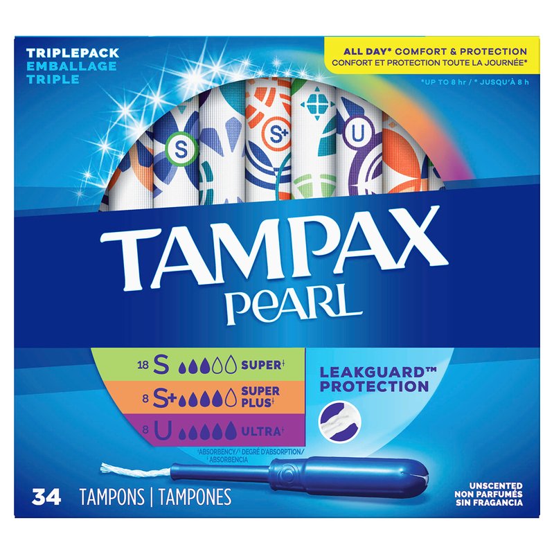 Tampax Pearl Tampons Trio Pack, Super/Super Plus/Ultra Absorbency with BPA-Free Plastic Applicator and LeakGuard Braid, Unscented, 34 Count