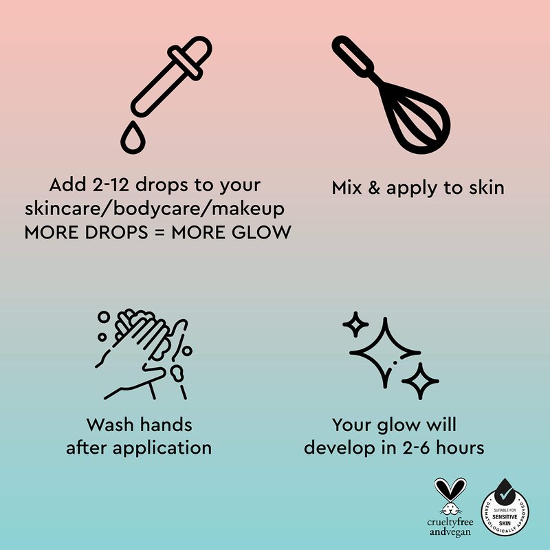 - DROP. MIX. GLOW. Meet our concentrated Tan Drops. Mix self tan drops with your skincare, makeup or body care. This flexible formulation is perfect for both newbies & experienced tanners who love a natural looking fake tan