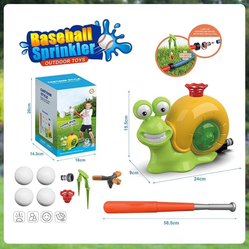 - Ideal Summer Water Play: The outdoor kids play equipment includes: snail toddler sprinkler* 1, water column nozzle * 1, 360° rotating nozzle * 1, retractable baseball bat * 1, baseballs * 4, ground stake * 1