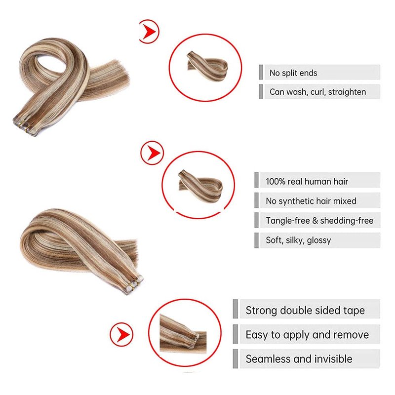 - 【Most Fashionable Ombre Color】-- Our tape in hair extensions human hair are P#6/613, Chestnut brown combined with caramel blonde color, natural design warm tone color for you. Matched your hair color perfect. Can be dyed, strengthened, curled.