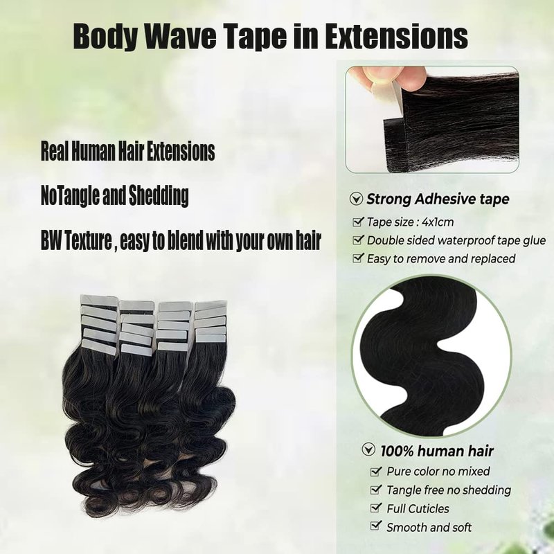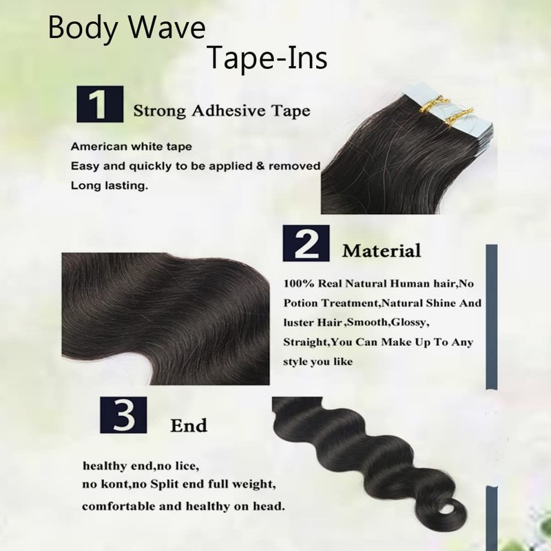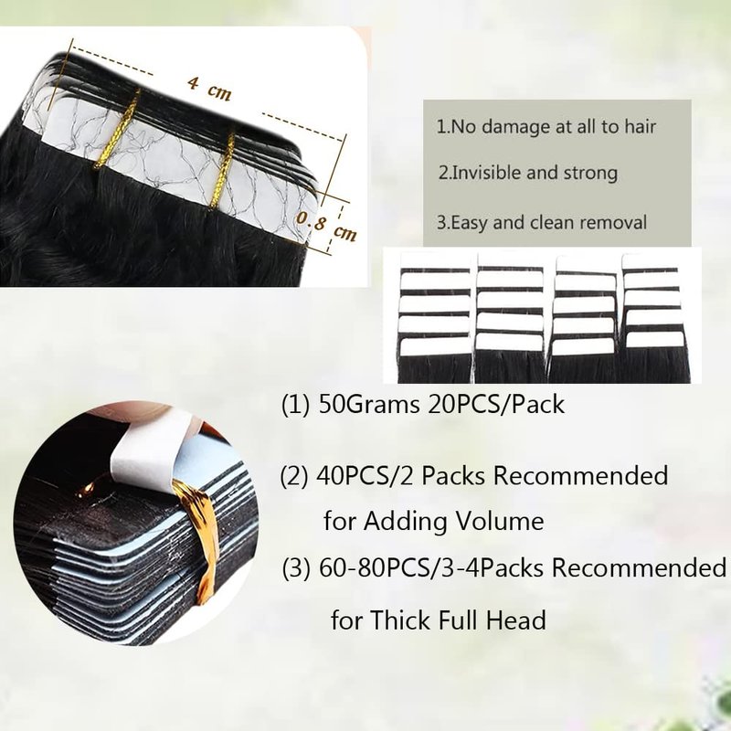 • 【50grams 20pcs for Body Wave Tape in Hair Extensions Human Hair】 Tape ins are perfect for relaxed natural hair color; the body wave tape in hair extensions human hair feel very soft and natural looking with great curls; each pack has 20 pieces and weighs 50grams, usually 1 or 2 packs are enough for thick hair, 3 or 4 sets for short thin hair.