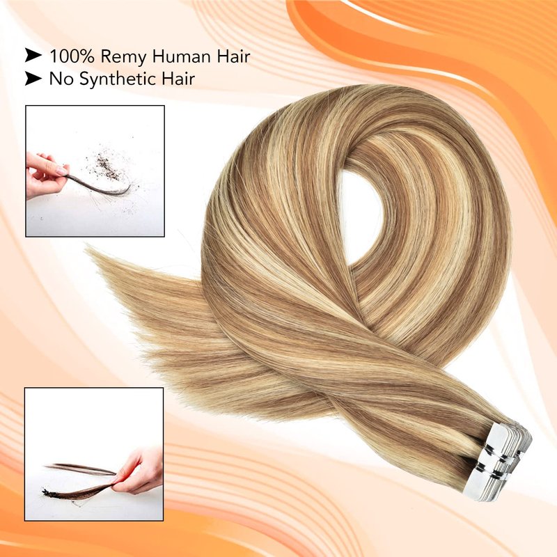 Tape In Hair Extensions Human Hair Camel Brown Mixed with Bleach Blonde #8/613 Real Human Hair 20 Inch Tape In Extensions 20pieces 50g/Pack Invisible Tape Extensions Remy Human Hair