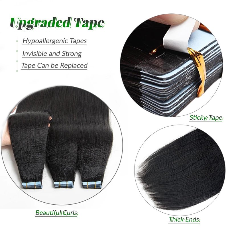 - Yaki Straight Tape in Hair Extensions: yaki straight is the perfect texture for a natural silk press look on natural hair and this yaki tape in extensions will take your hair to the next level; the curl patterns are true to the pictures online and keep the same from the top to bottom; now we have tape ins with more than ten different textures and you can always find one matching your hair type