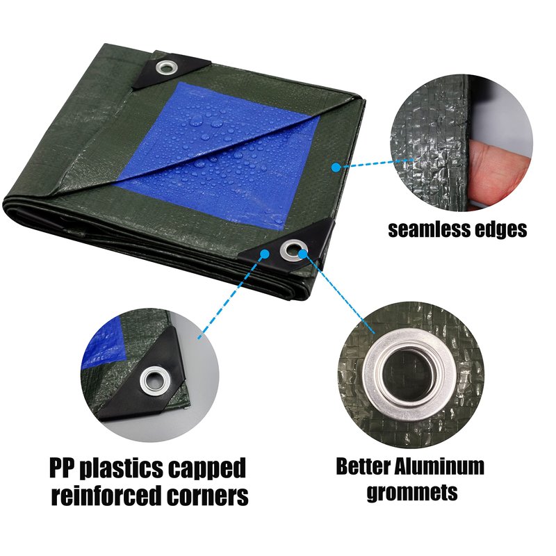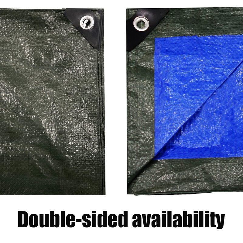- 【Double-sided use· Reinforced edges】Our tarp can be used on both sides, one side is green, the other side is blue, you can choose the appropriate color according to your needs.The edges of the tarp are reinforced to fit,metal grommets every 35 inches.