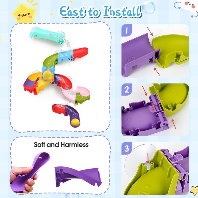 - 🌊Educational and Creative Shower Toys -- Bath toys can be combined in different ways to DIY various track shapes that they like, in order to stimulate children's imagination, creativity and hands-on ability. The bright colours and rolling balls spiral down from the track to quickly attract your baby's attention, and your baby can try to catch the ball before it falls into the bathtub, making bath time more fun!