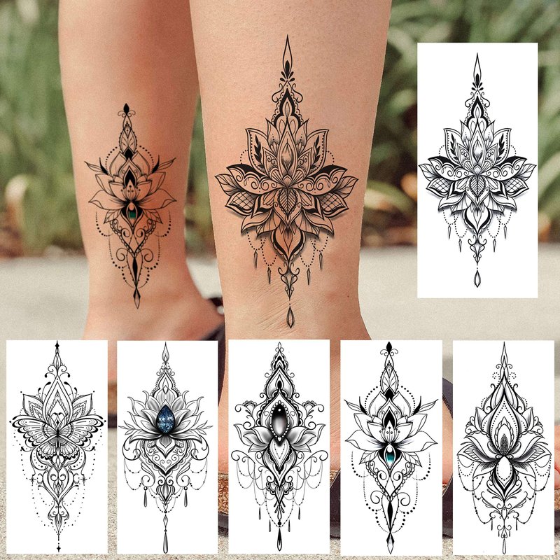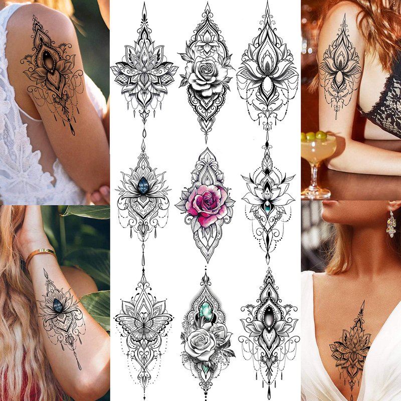 TASROI 32 Sheets Sexy Black Lotus Temporary Tattoos For Women Girls Indian Tribal Lace Tatoo Sticker Neck, Mandala Flower Butterfly Rose Tattoo Temporary Dreamcatcher Elephant Henna Tattoo Kit Adults