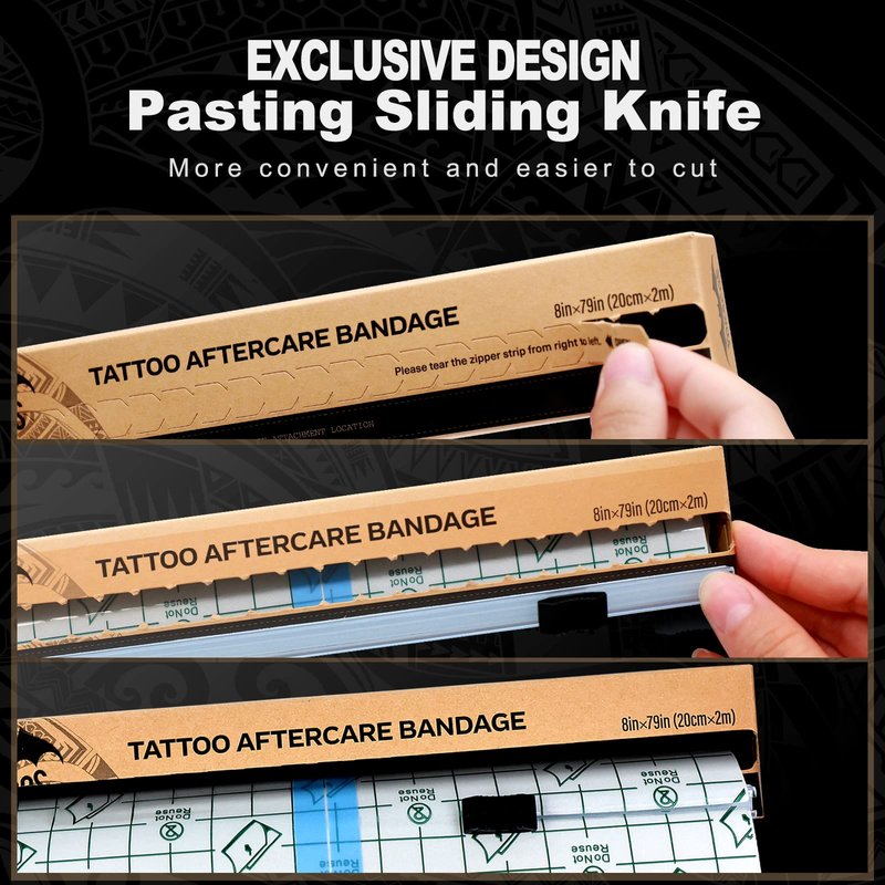 - 【Not Need Scissors Anymore!】YOKACOS tattoo bandage wrap feature the latest design of safe-to-use and easy-to-cut strips. Sticking the slide cutter and sliding it, a bandage of the right size is finished. Not afraid of losing, at any time to accurately position. Only a simple pushing, say goodbye to trouble scissor cutting.