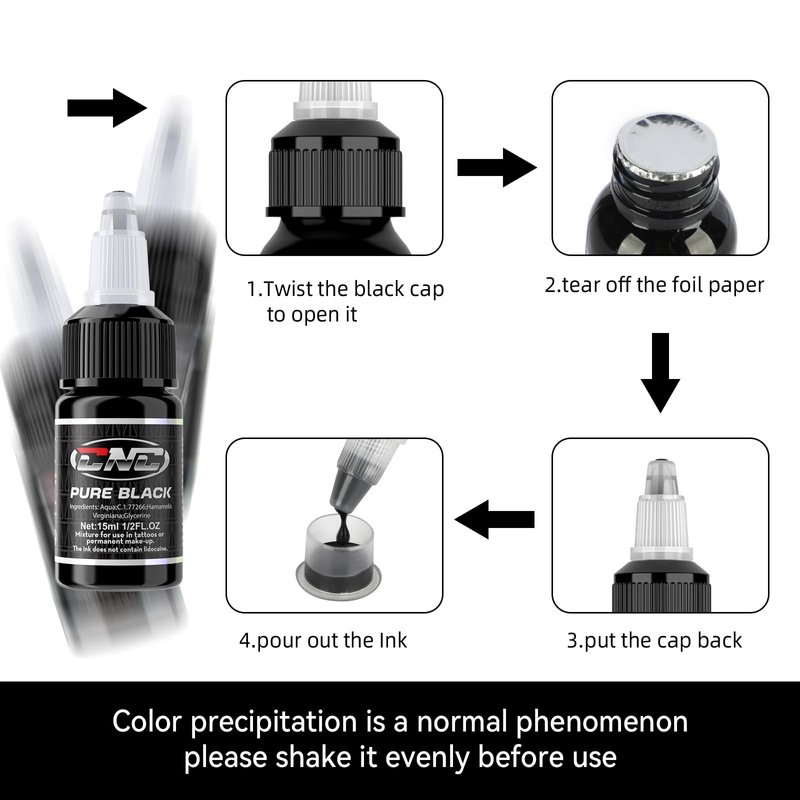 - ✔️Note: Please shake the bottle sufficiently before using the ink and try it on a small area on the skin to observe if you are allergic, do not use if you are allergic. When tattoowork finished, use the twist cap to securely seal the bottle until next use.