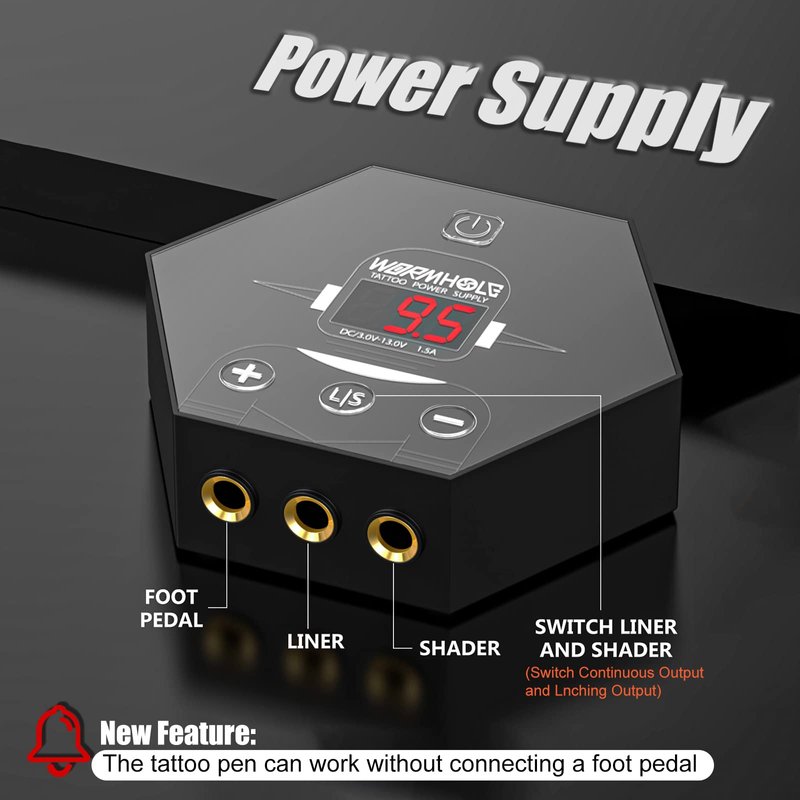 - ☀TATTOO KIT PACKAGE: The Wormhole Tattoo pen kit includes 1 x tattoo pen, 20 x tattoo cartridges needles, 1 x self cohesive tattoo grip cover, 1 x tattoo power supply, 1 x RCA cord, 1 x foot pedal, 40 x ink caps, 1 x practice sheet, 5 x transfer paper, 10 x 5ml tattoo ink, 1x 30ml blank tattoo ink, 1 x tattoo gloves, 1 x clip cord sleeve, and 1 x instruction. The complete tattoo kit is a good choice for beginners, starters, and apprentices.