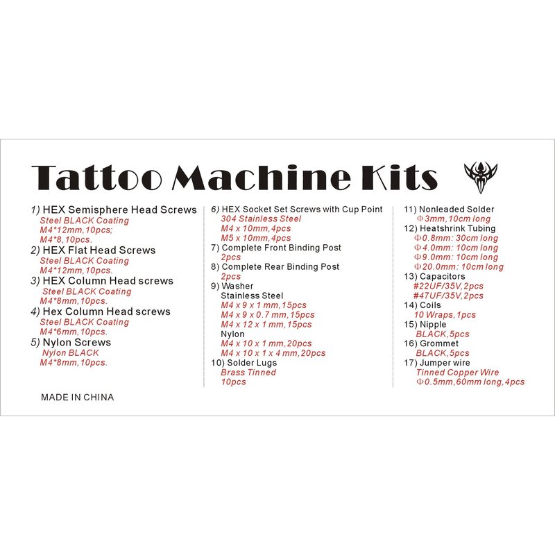 Everything you need to maintain or rebuild your tattoo machine is found in our Machine Kit. From washers and tubing to binding posts and screws, the Machine Kit comes with 190+ parts to keep you prepared. The parts come in a reusable double sided tackle style box.