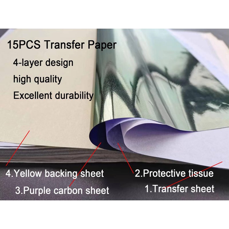 - 4 Layers Tattoo Transfer Paper: The tattoo transfer paper is made of high-quality dyes and wax paper. No fading, no easy dyeing, keep it clean and reusable. Easy to use. 4 layers of transfer paper, the first layer of white master; 2 layers of translucent protective paper; three layers of blue carbon pages; the 4th layer of yellow backplane. Tattοο stencil transfer paper can be easily, cleanly, and smoothly transferred tattοοs to the skin. Also can be cut down into smaller sheets for more use.