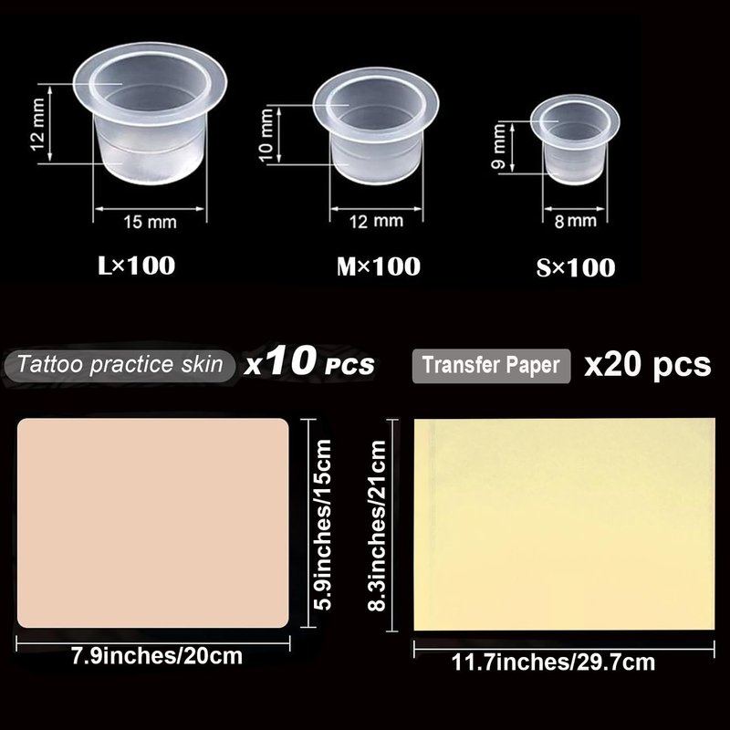 - 👍PACKAGE AND SIZES - The 330 Tattoo Fake Skin with Stencil Paper Ink Cups Including 300Pcs mixed ink caps #10 Small #14Medium #17 Large (each size 100pcs) and 10Pcs 7.9*5.9 inch Double Sided Blank Tattoo Fake Skin and 20Pcs 11.7*8.3 inch Tattoo Transfer Paper. The best combination of tattoo skin and pigment ink cups and Tattoo Transfer Paper which greatly facilitates your various needs. Help you save time and get a great deal. Providing enough space for your masterpiece creation.