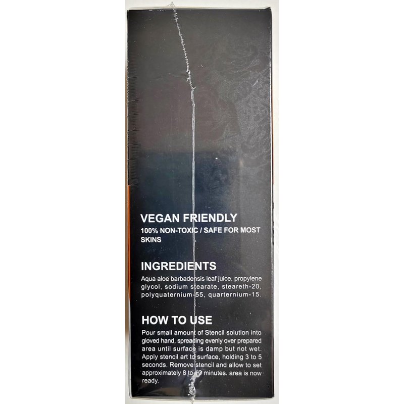 Pour small amount of Stencil solution into gloved hand, spreading evenly over prepared area until surface is damp but not wet. Apply stencil art to surface, holding 3 to 5 seconds. Remove stencil and allow to set approximately 8 to 10 minutes. area is now ready.