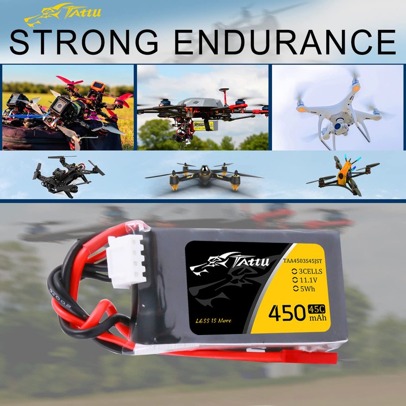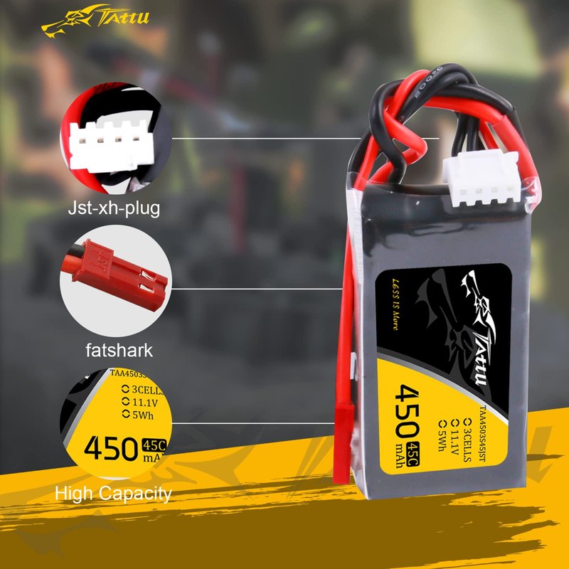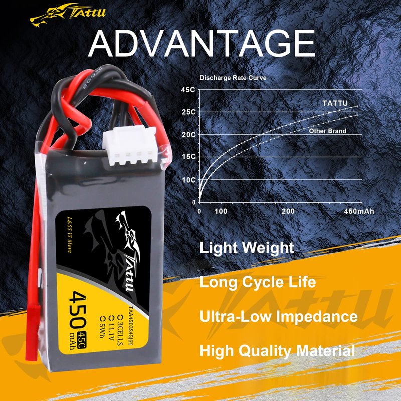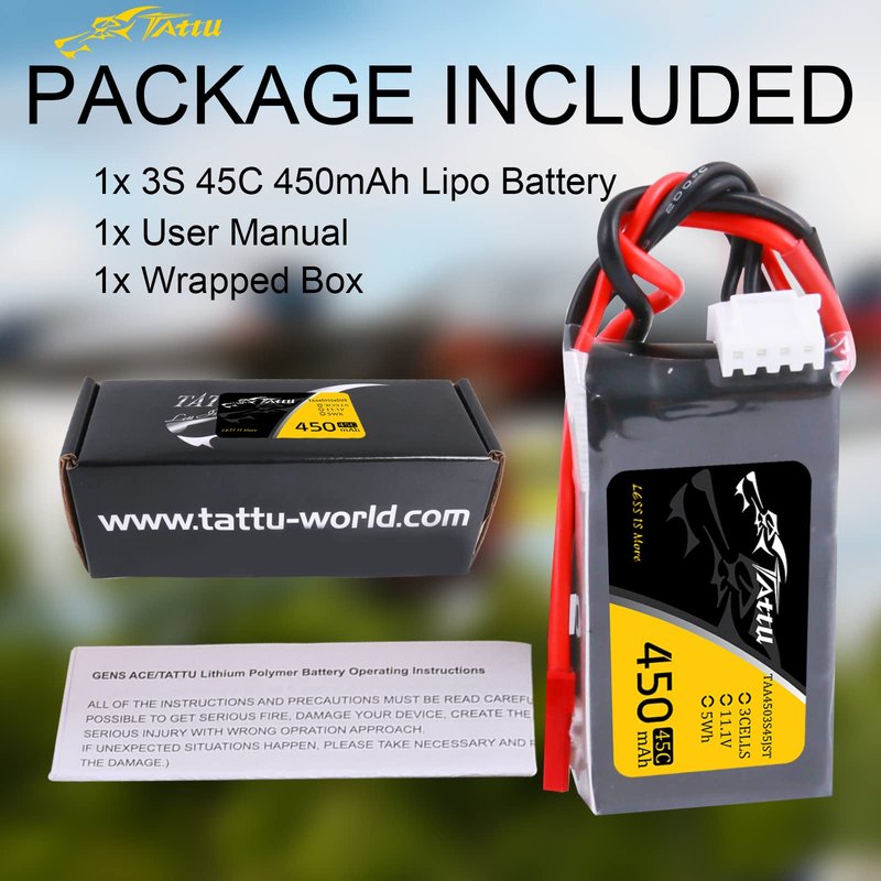 - Tattu 11.1V 450mAh Lipo battery Specification:Battery Voltage:11.1V;Configuration:3S1P; Capacity:450mAh;Discharge: 45C Plug: JST Plug.