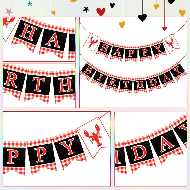 13 cards with single letters that spell the phrase "HAPPY BIRTHDAY" and 2 crayfishing design cards placed on both sides. Hanging on the ceiling, on the table, the balcony, or on the tree branches, You can also match our products with other decorations, and use your imagination to make your own DIYproduct!!