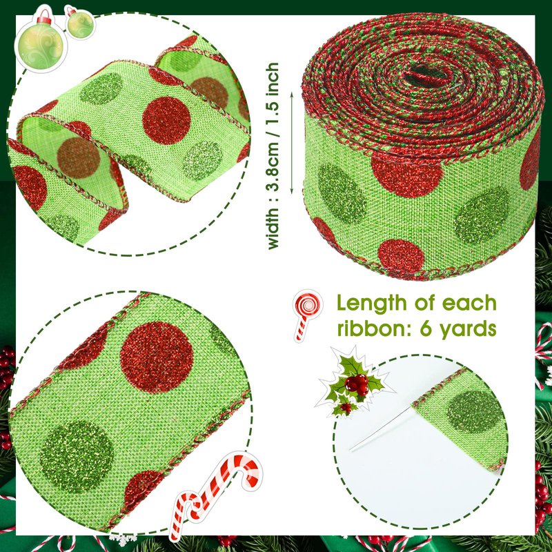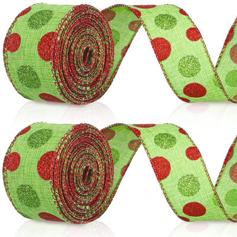 Tatuo 2 Rolls Christmas Wired Ribbon Christmas Glitter Burlap Ribbon Green Red Polka Dot Ribbon Christmas Tree Decoration DIY Craft Bows Wreath(Green Base, 1.5 Inch x 6 Yard Per Roll)