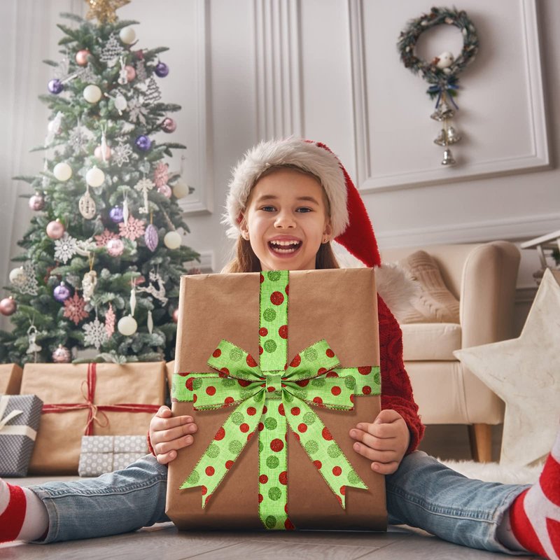 - Package receive: there are 2 rolls Christmas glitter dot wired edge ribbons in the package, measuring approx. 6 yard/ 216 inch in length, a total length of 12 yard (2 rolls), long enough to satisfy your decoration needs, which can make your creative DIY ideas and imaginative thoughts come true