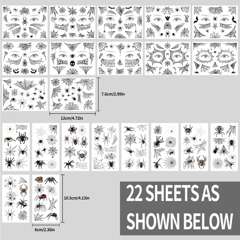 - 【Spider Wed Tattoos】 You will receive 22 sheets of spider tattoos in different styles, each sheet contains various designs and sizes, enough quantity can meet your different decorative demands, and assorted styles will add much fun to your theme party, costume party, etc.