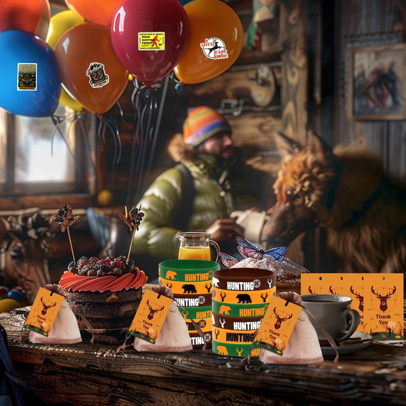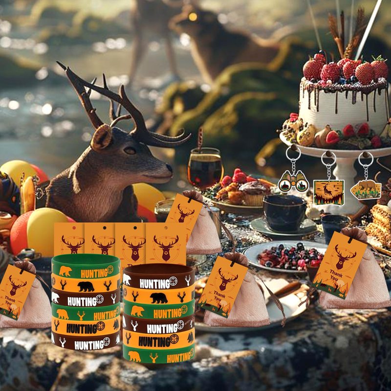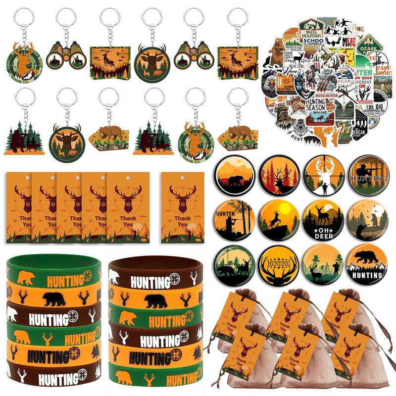Tazimi 110 PCS Hunting Party Favors Hunting Birthday Party Supplies Camo Party Favors with Hunting Keychains Stickers Rubber Bracelets Button Pins and Bags for Hunting Theme Party