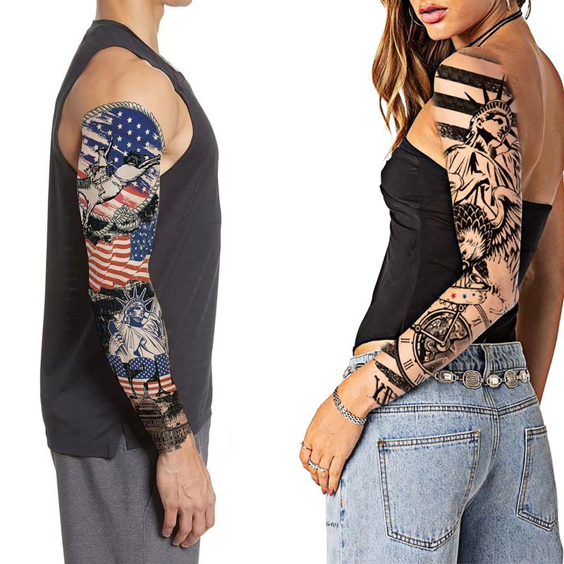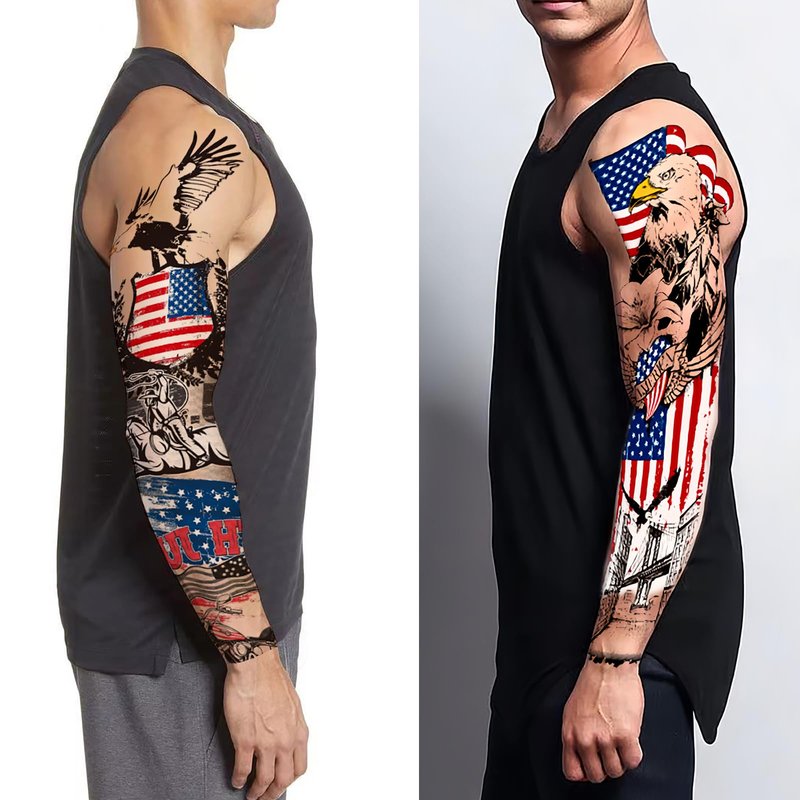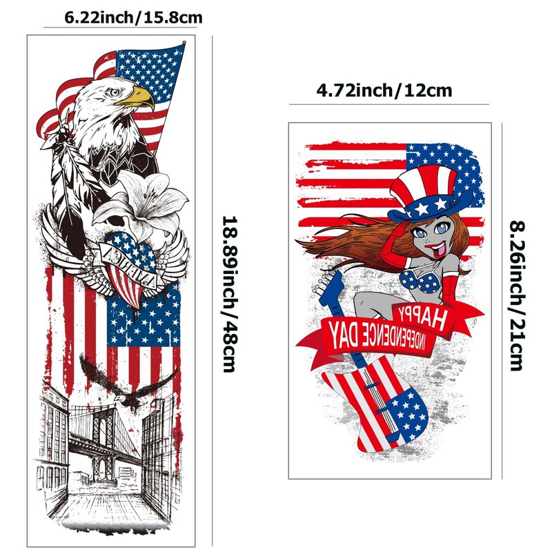 - 【Large Independence Day Temporary Tattoos】Tazimi original collection of 16 large classic temporary tattoos,It Contains 4 sheets 18.9 * 6.2 Inch (48 * 15.8cm) 4th of july full sleeve temporary Tattoos and 12 sheets 8.2* 4.7 Inch (21 * 12cm) USA patriotic half sleeve fake tattoo stickers for adults men women . you can share It with your family and friends. enjoy expressing yourself with these colorful tattoos!