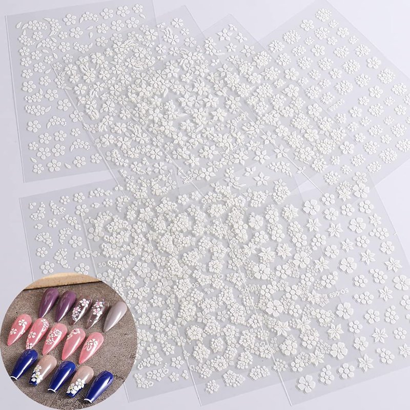 TBRZTR 8 Sheets Flower Nail Art Stickers Decals 3D Self-Adhesive White Floral Nail Decals Self-Adhesive Nail Art Supplies Flowers Nail Accessories for Women Manicure Decorations Design