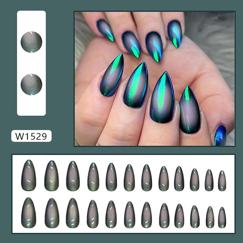 TBRZTR Press on Nails Medium Length Artificial Acrylic Nails Cat Eye Design Full Cover Glossy Reusable False Nails Almond Shaped Fake Nails Glue on Nails for Women Supplies 24Pcs